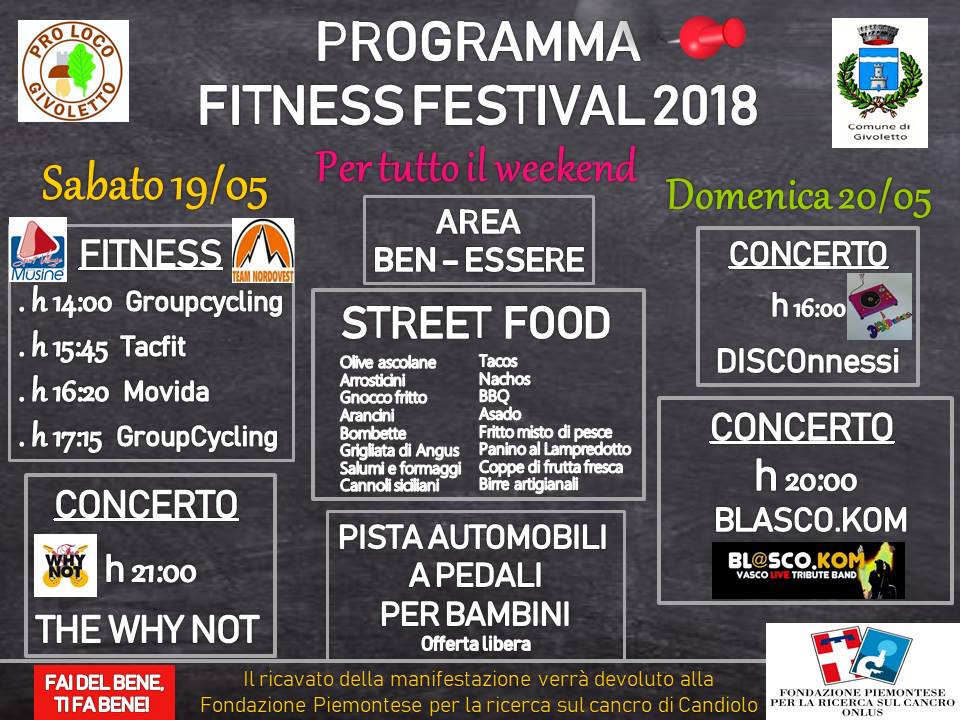 Il Fitness Festival è cresciuto! Quest'anno apre le porte a due giorni di sport, divertimento, concerti e intrattenimento per bambini. In più per tutto il weekend, per sportivi e non, arriva lo Street Food: i migliori operatori enogastronomici con specialità e cibi provenienti da tutto il mondo! Il ricavato della manifestazione verrà devoluto alla Fondazione Piemontese per la Ricerca sul Cancro di Candiolo.
