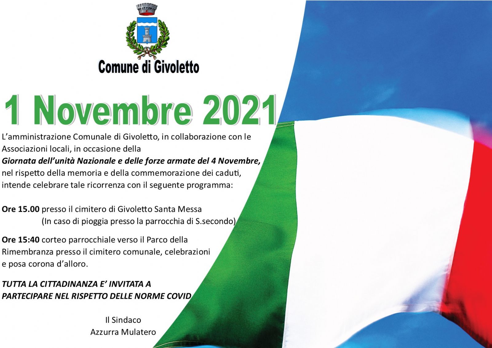 L'Amministrazione Comunale di Givoletto, in collaborazione con le Associazioni locali, in occasione della Giornata dell'Unità Nazionale e delle Forze Armate del 4 Novembre, nel rispetto della memoria e della commemorazione dei caduti, intende celebrare tale ricorrenza. Tutta la cittadinanza è invitata a partecipare lunedì 1 Novembre come da programma in volantino e nel rispetto delle norme Covid.