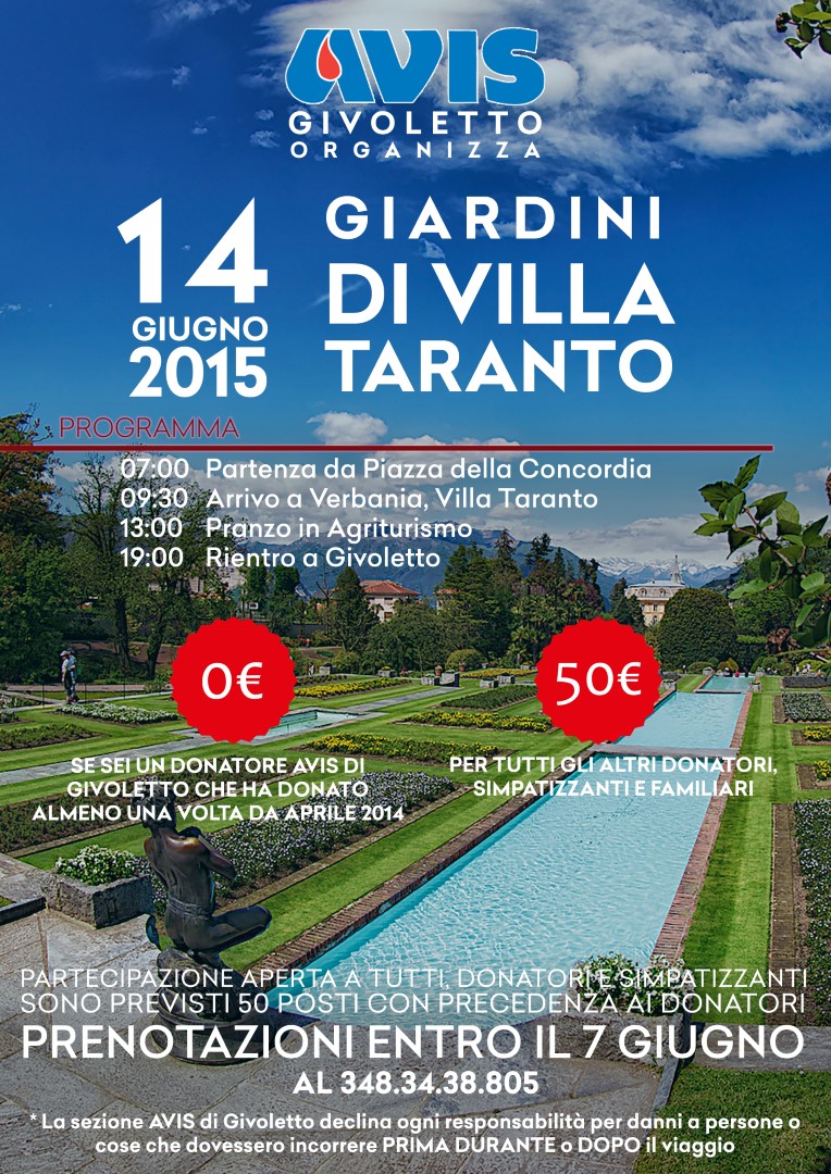 Il giorno 14 giugno L'AVIS di Givoletto organizza una gita aperta a tutti ai Giardini di Villa Taranto a Verbania