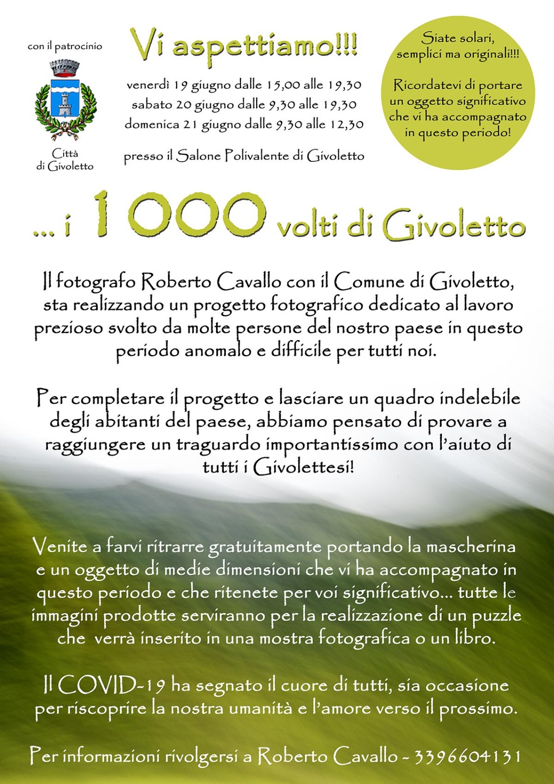 Venite a farvi fotografare gratuitamente, la vostra immagine servirà per realizzare un grande puzzle per il progetto “… i 1000 volti di Givoletto”.