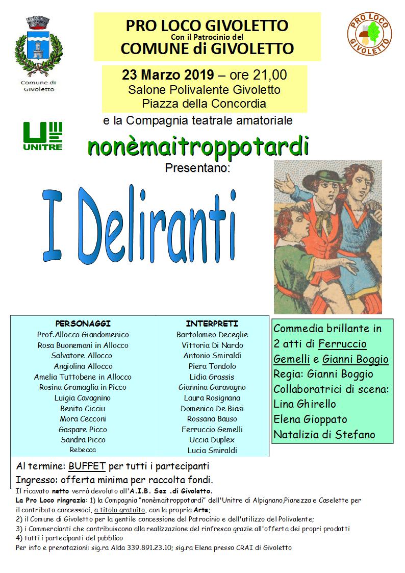 La Proloco Givoletto con il patrocinio del Comune di Givoletto, Sabato 23 Marzo alle ore 21:00 presso il salone polivalente di Givoletto, presenta lo spettacolo della compagnia teatrale “nonèmaitroppotardi” intitolato: I Deliranti. Commedia brillante in due atti di Ferruccio Genelli e Gianni Boggio.