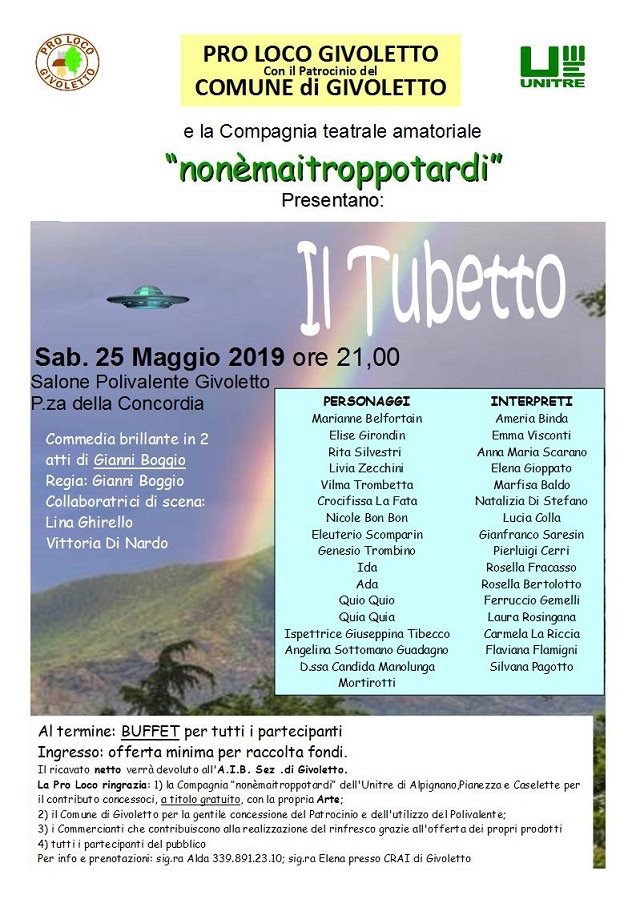Sabato 25 Maggio alle ore 21.00 presso il salone polivalente di Givoletto, andrà in scena la commedia brillante in due atti di Gianni Boggio.
