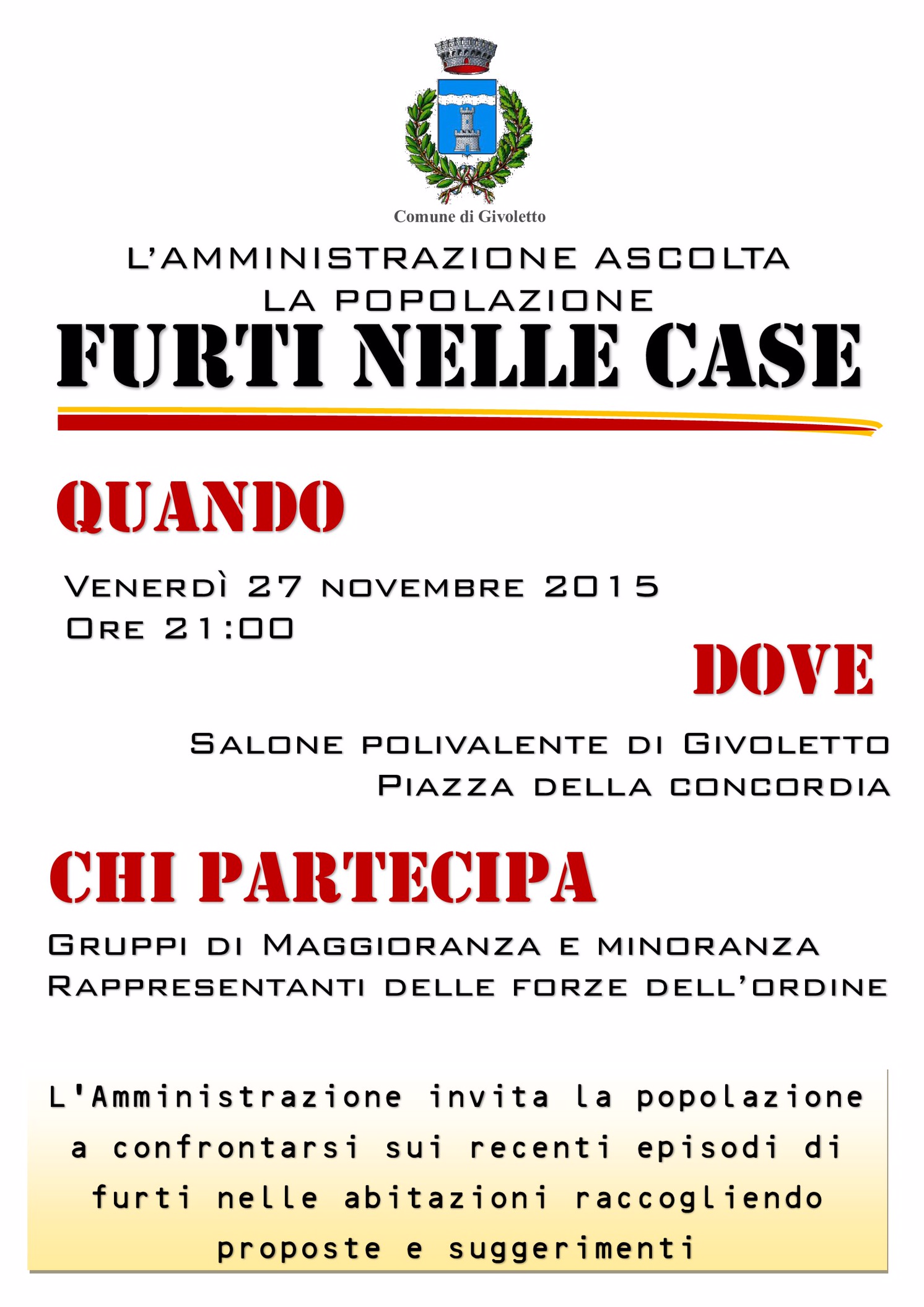 A seguito dei recenti episodi di furto che si sono registrati nelle abitazioni dei Givolettesi, Venerdì 27 Novembre alle ore 21:00 presso il Salone Polivalente di Givoletto, l'Amminstrazione si confronta con i cittadini, raccogliendo proposte e suggerimenti.