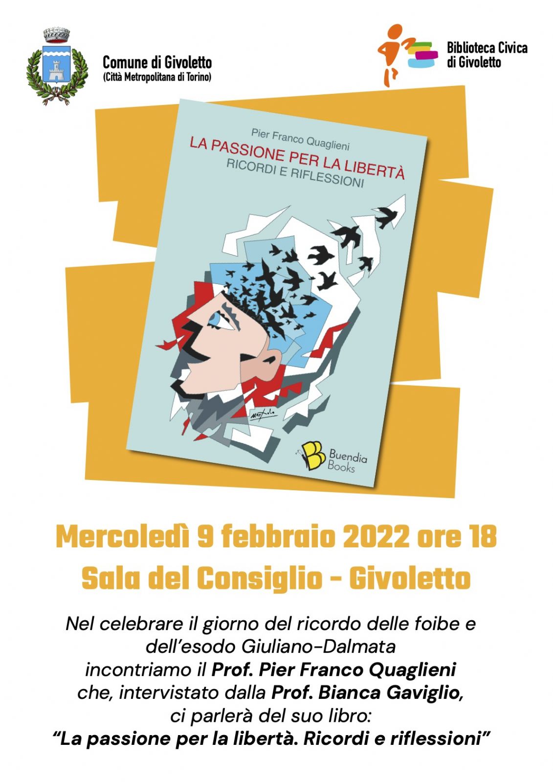 Mercoledì 9 Febbraio alle ore 18, presso la sala consiliare, nel celebrare la "Giornata del Ricordo" delle foibe e dell''esodo Giuliano-Dalmata, incontriamo il Prof. Pier Franco Quaglieni che, intervistato dalla Prof. Bianca Gaviglio, ci parlerà del suo libro: "La passione per la libertà. Ricordi e riflessioni"