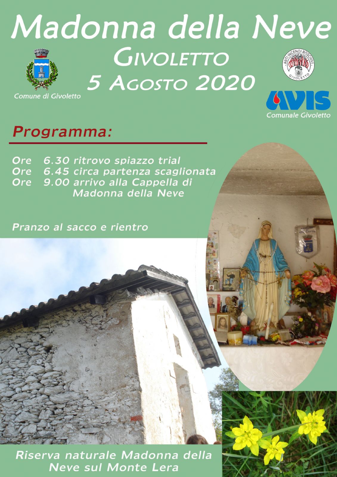 Anche quest’anno siete tutti invitati alla cappella della Madonna della Neve in occasione della festa del 5 Agosto. Sul volantino è indicato il programma con gli orari. In caso di pioggia o mal tempo, l’escursione non avrà luogo.