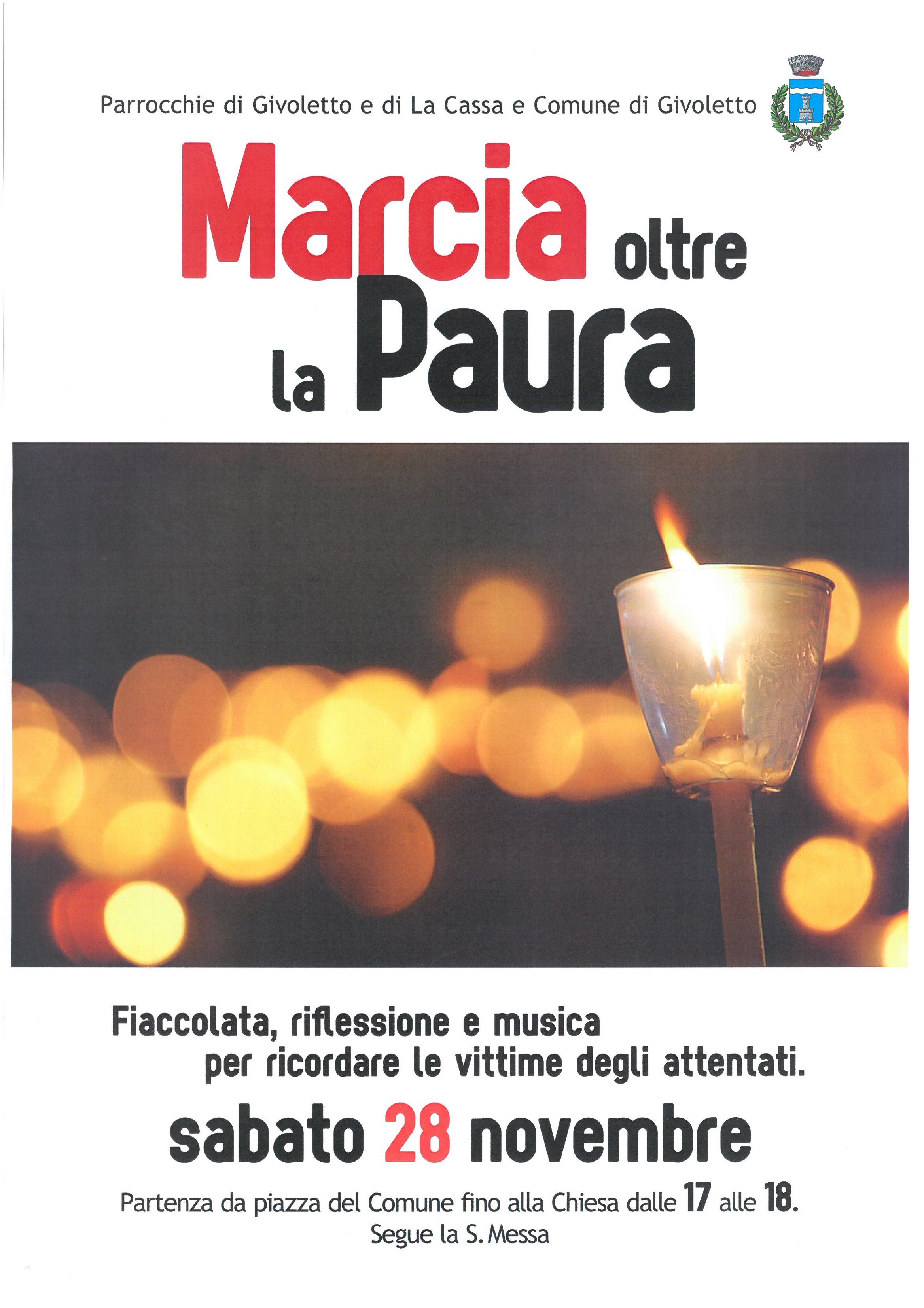 Le parrocchie di Givoletto e La Cassa con il Comune di Givoletto organizzano una fiaccolata per ricordare le vittime degli attentati. L'appuntamento è per Sabato 28 Novembre dalle ore 17.00 alle ore 18.00. Partenza dalla piazza del Comune e arrivo alla Chiesa di Givoletto, dove seguirà la S. Messa.