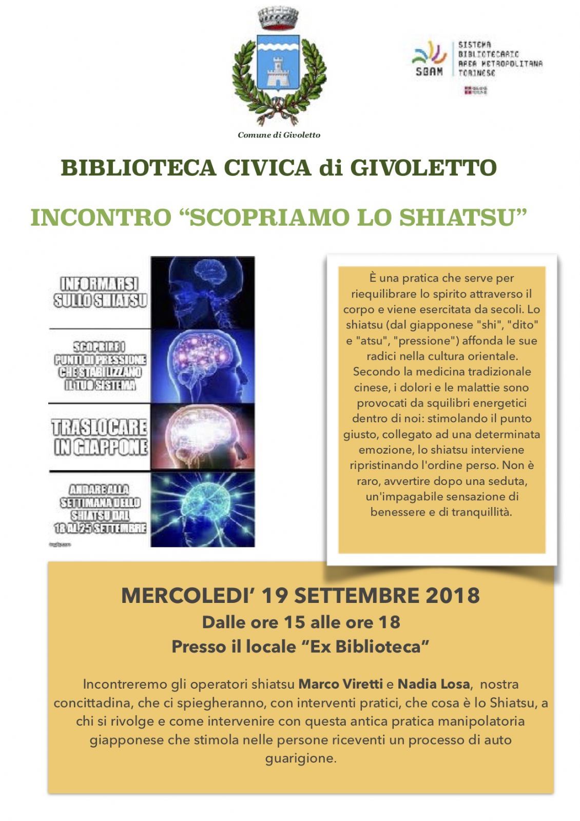 A Givoletto, nella sala “ex Biblioteca”, mercoledì 19, dalle 15 alle 18, incontreremo gli operatori Shiatsu Marco Viretti e Nadia Losa che ci spiegheranno, anche con interventi pratici, questa antica pratica giapponese.