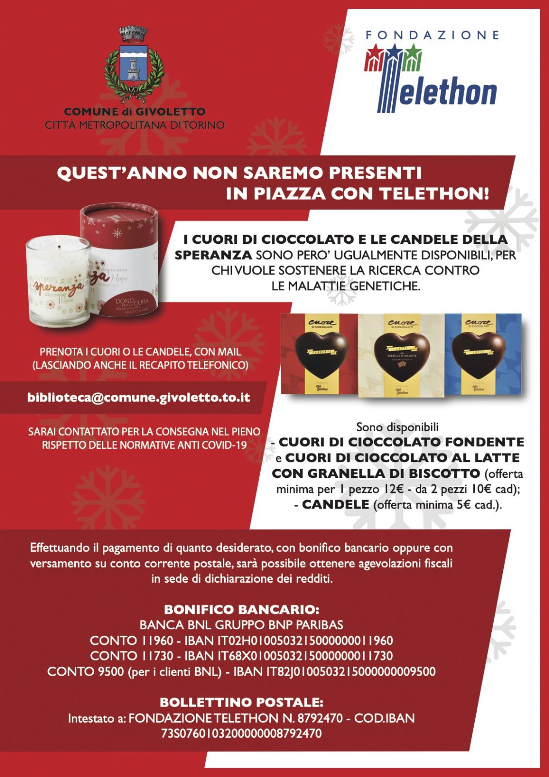 Quest’anno, considerato il periodo di emergenza sanitaria e delle conseguenti limitazioni di circolazione, per garantire l’osservanza del protocollo anti Covid-19 non sarà allestito il banchetto “Casa Telethon” presso il Centro Commerciale, ma per dare la possibilità ai givolettesi di partecipare alla raccolta di offerte per la Fondazione Telethon. abbiamo pensato di pubblicizzare la raccolta benefica sul sito del Comune e sui social.
