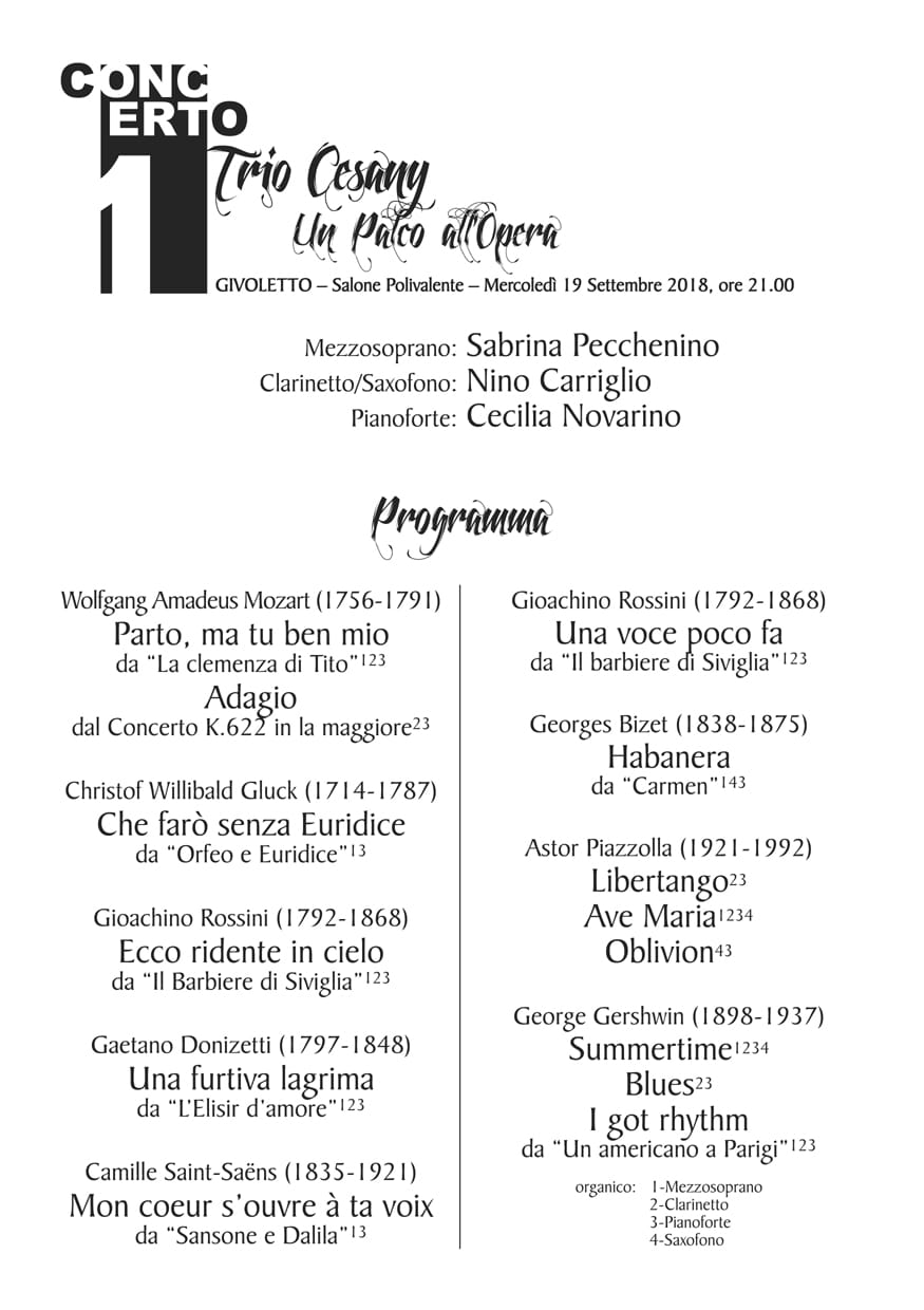 Mercoledì 19 Settembre presso il Salone Polivalente di Givoletto alle ore 21.00 avrà luogo il concerto inaugurale della stagione concertistica Autunno-Inverno 2018. Il Trio Cesany presenterà - Un palco all'opera - con l'intento di coinvolgere lo spettatore in un viaggio sonoro, attraverso le melodie e le arie d'opera più celebri ed amate dal grande pubblico