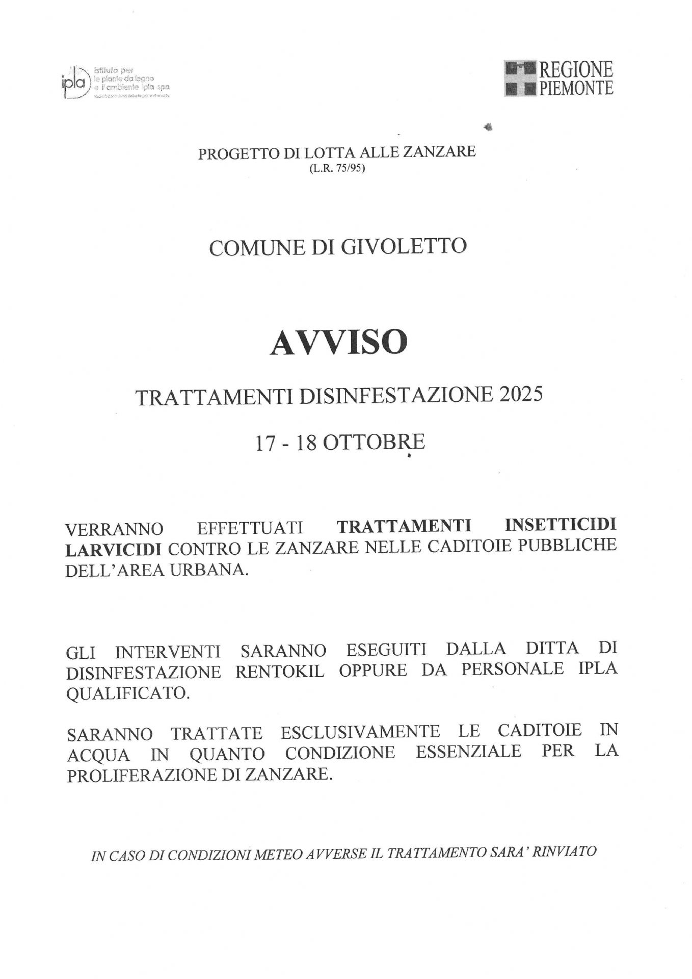 l'Ipla informa che nelle giornate di 17-18 ottobre 2025 verranno effettuati trattamenti insetticidi larvicidi contro le zanzare nelle caditoie pubbliche dell'area urbana.