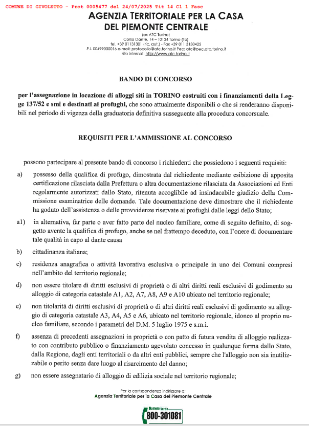 BANDO DI CONCORSO per gli alloggi siti in TORINO costruiti con i finanziamenti della Legge 137/52 e smi e destinati ai profughi e relativa domanda di assegnazione.