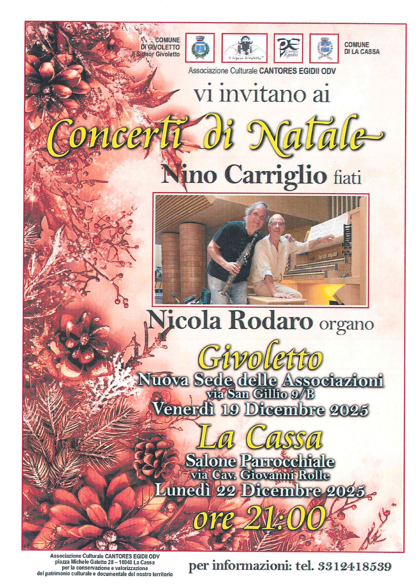 Si invita la cittadinanza ai Concerti di Natale, di musiche natalizie, con Nino Carriglio (fiati) e Nicola Rodaro (organo), in due date:
